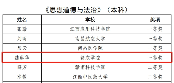 经过激烈角逐和严格评审,全省本科高校评选出一等奖24名、二等奖36名、三等奖48名。我校4位教师脱颖而出,斩获佳绩!2名教师荣获一等奖,2名教师荣获二等奖。 我校获得一等奖的人数在全省本科高校中名列第一。在《思想道德与法治》本科组,魏琳华荣获一等奖;在《红色文化》本科组宣萍荣获一等奖;在《马克思主义基本原理》本科组李壹荣获二等奖;在《毛泽东思想和中国特色社会主义理论体系概论》本科组郑志英荣获二等奖。
